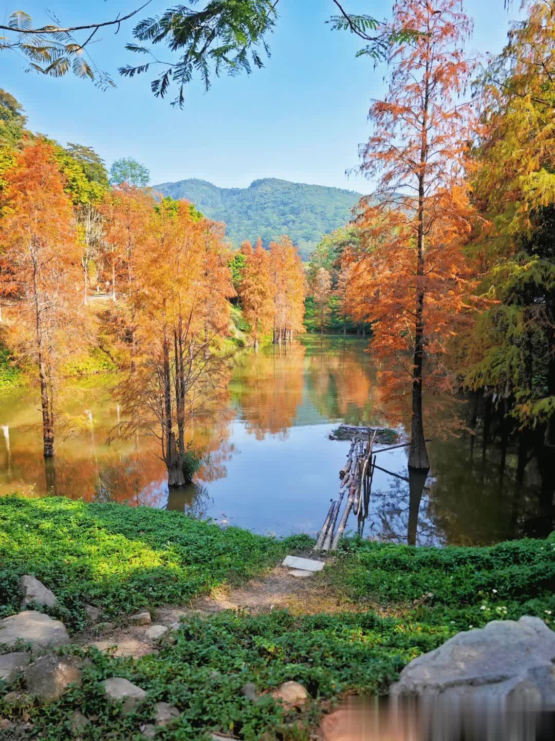 我们接着往前走,会遇到两个小湖泊,湖边围满了落羽杉,这里的景色用“美”已经不足以形容。