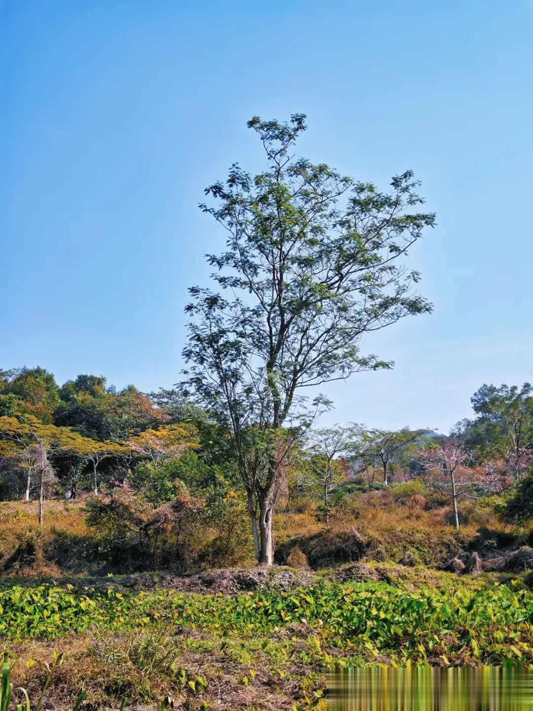 路的尽头豁然开朗,草地上孤独的伫立着一颗高耸入云的大树,目测应该有4、5层楼那么高,静静地在那里站着。