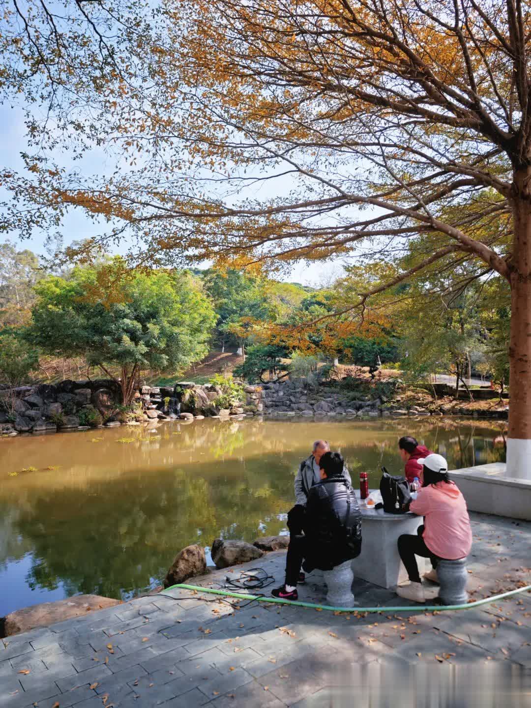 湖边种满了大树,游客围坐在石桌旁聊天吹水,一进门的景色就让人走不动路了,而这仅仅只是开始。